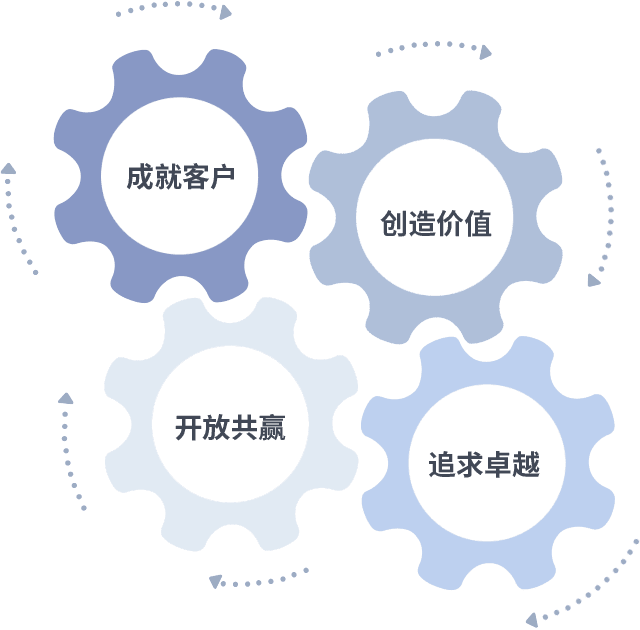 成就客户是一切决策的出发点,,,,创造价值是衡量所有工作的标准,,,,追求卓越是我们做事做人的态度,,,开放共赢是我们的格局也是最终的结果。。价值观的齿轮环环相扣,,,推动着组织里的每个人不断向前。。。。