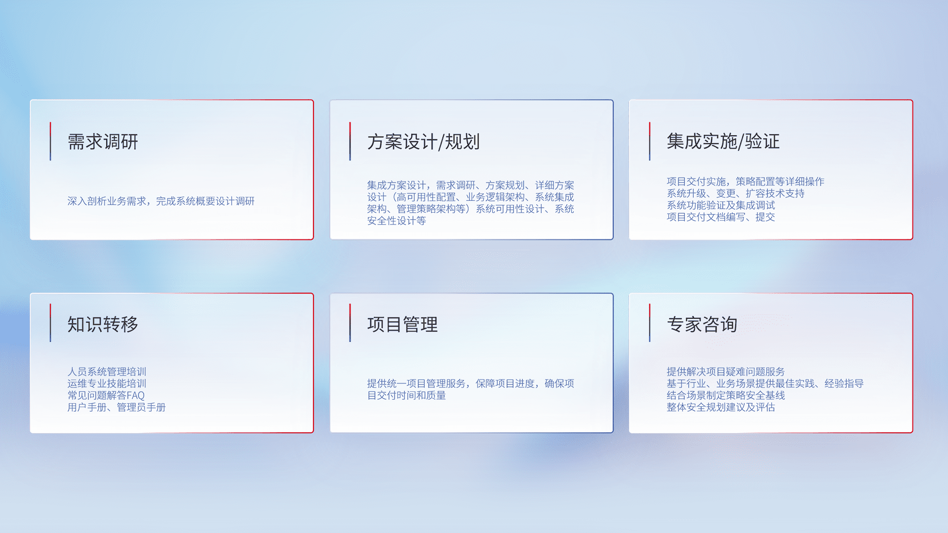 针对客户行业特性,,将宏观的安全战略和需求,,,,通过专业的交付服务,,,,实现项目落地,,,,为客户提供标准规范的集成交付服务。。。
